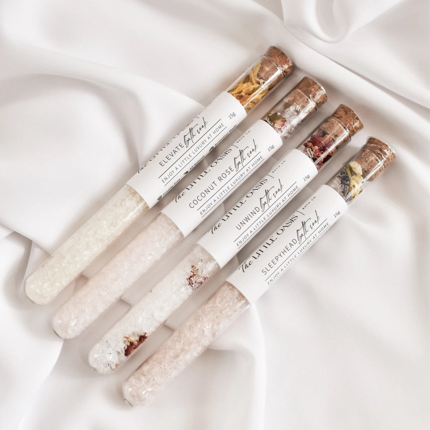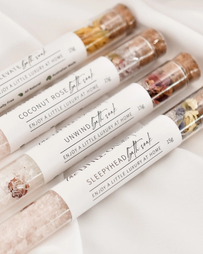 Whether you're trying to forget the stress of a long day at work (or homeā¦), creating a warm and inviting space to read your favourite book with a cheeky glass of red or taking an Instagram-worthy "because I can" self-care bath, our bath soaks will have your mind feeling relaxed, your skin feeling nourished and your muscles ready to tackle another day.