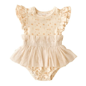 Beautiful Ruffle Tutu Romper featuring statement double ruffle and soft tulle tutu skirt. Snaps on shoulder and crutch for easy changes. Made from soft organic cotton in our new Christmas Star print.