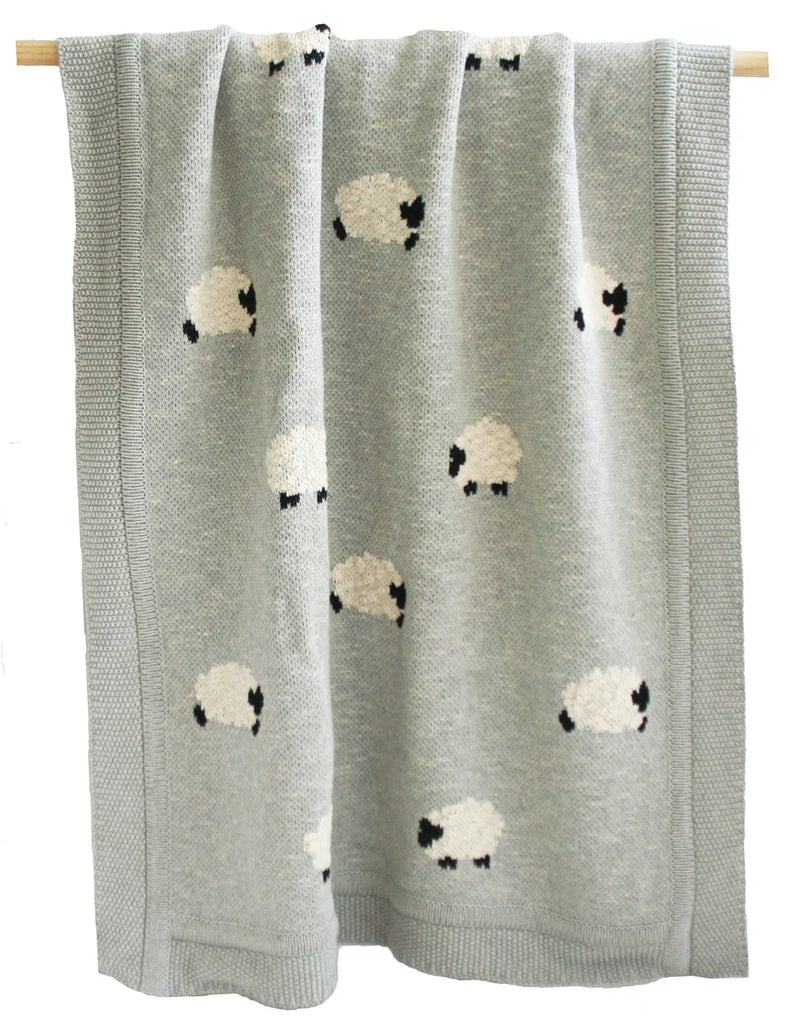 A gorgeous 100% cotton knit baby blanket featuring little woolly leaping sheep. Adorable!
