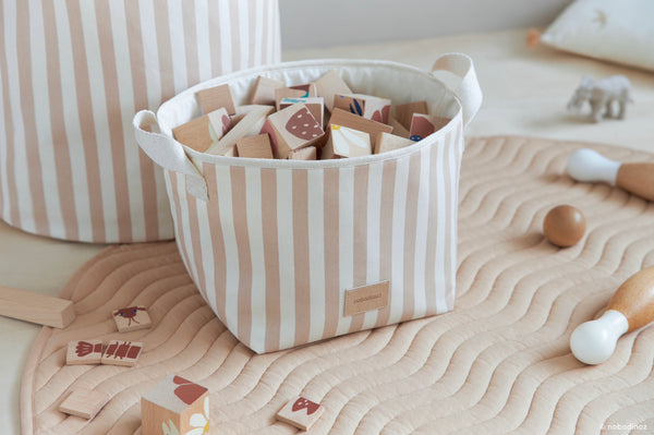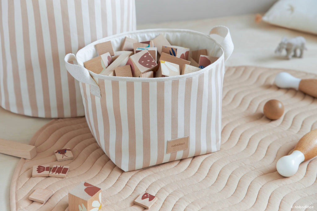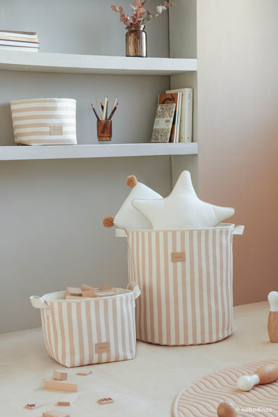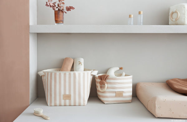 The Django basket is the practical decorative element that you always need. Ideal for storing small toys or accessories for changing your baby. Nobodinoz fabric storage baskets will help you organise any space in your home. Combine the different sizes and colours and enjoy an organised everyday life.